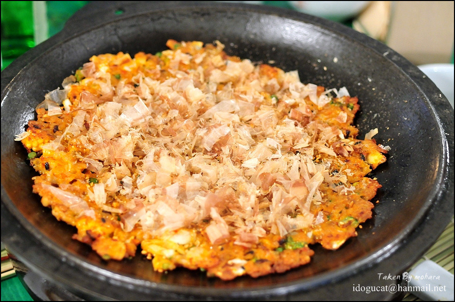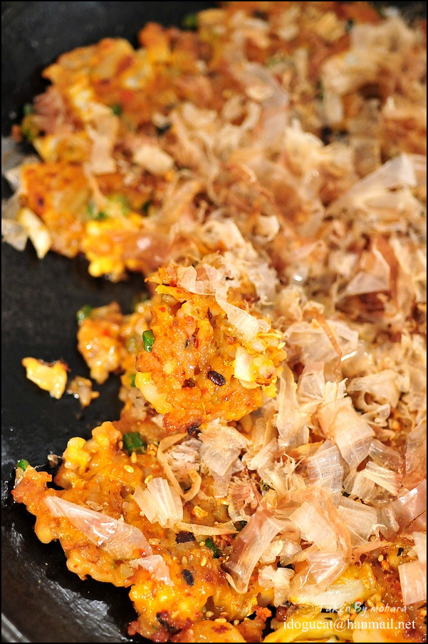 마치 오꼬노미야끼를 연상케 만드는 맛의 밥전 위에는 가츠오부시가 올라가 오그라들며 춤추는 모습을 보며 김치가 섞여 만들어진 밥전을 음미합니다.