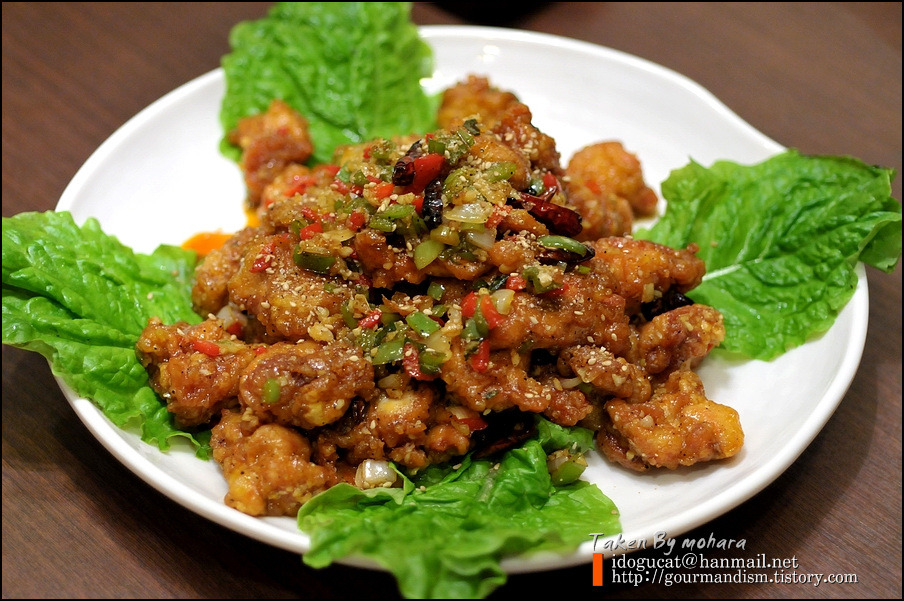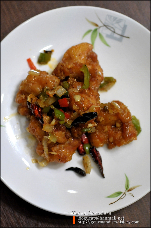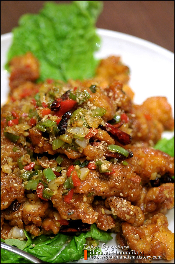 닭고기를 기름에 한번 튀겨 내 매콤한 양념으로 볶는데 파, 마늘, 고추등으로 센 불에 후다닥 볶아내는 것이 포인트.
