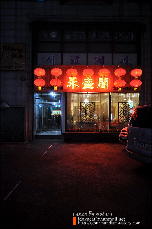아무래도 크리스마스인지라 미리 예약을 해 두고 7시 반 영성각으로 향했지요. 홍대역 1번 출구에서 내려 홍대입구 사거리로 이동 후 사거리에서 홍대 반대방향(서교동)으로 직진하다보면 청기와 예식장이 나오고 (건너편으로는 VIP) 약간 더 직진하면 영성각이 나옵니다. 워낙에 추웠던 날이라 가게 앞 홍등이 을씨년 스러워 보이기도 했답니다.