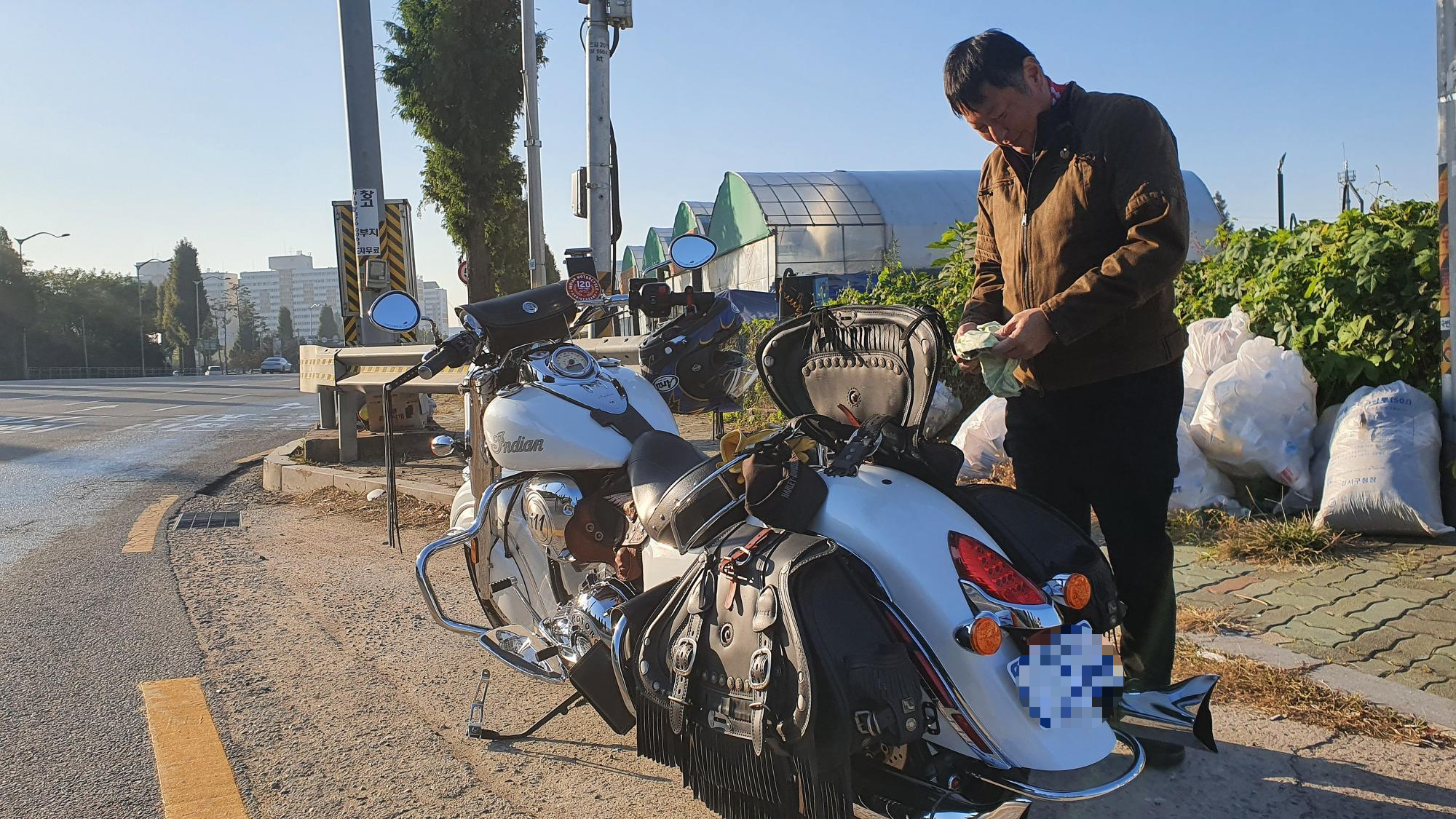오른쪽 토글 스위치를 눌러 공기압을 확인합니다. 앞바퀴는 240KPA(인디언 계기판의 공기압 단위는 미국에서 쓰는 KPA 단위로 표시됩니다), 괜찮습니다. 뒷바퀴를 확인하니 210KPA, 이런, 뒷바퀴가 펑크네요.......ㅋ