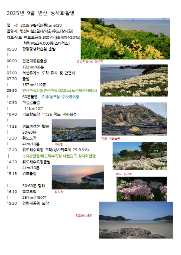 9월 변산 상사화촬영 9월4일(목) 인원미달 개별로 다녀 오세요! 작성자yihwan1981|작성시간25.08.29|조회수79 목록 댓글 0 글자크기 작게가 글자크기 크게가 2025년 9월 변산촬영.hwp2.78MB 다음검색 현재 게시글 추가 기능 열기 북마크 공유하기 신고 센터로 신고 댓글 댓글 0 댓글쓰기 답글쓰기 댓글 리스트