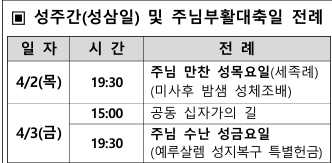 ▣ 성주간(성삼일) 미사 전례_2026.4.2(목), 4.3(금)_행사 작성자이남종삼요한|작성시간26.04.04|조회수74 목록 댓글 0 글자크기 작게가 글자크기 크게가 다음검색 현재 게시글 추가 기능 열기 북마크 공유하기 신고 센터로 신고 댓글 댓글 0 댓글쓰기 댓글 리스트