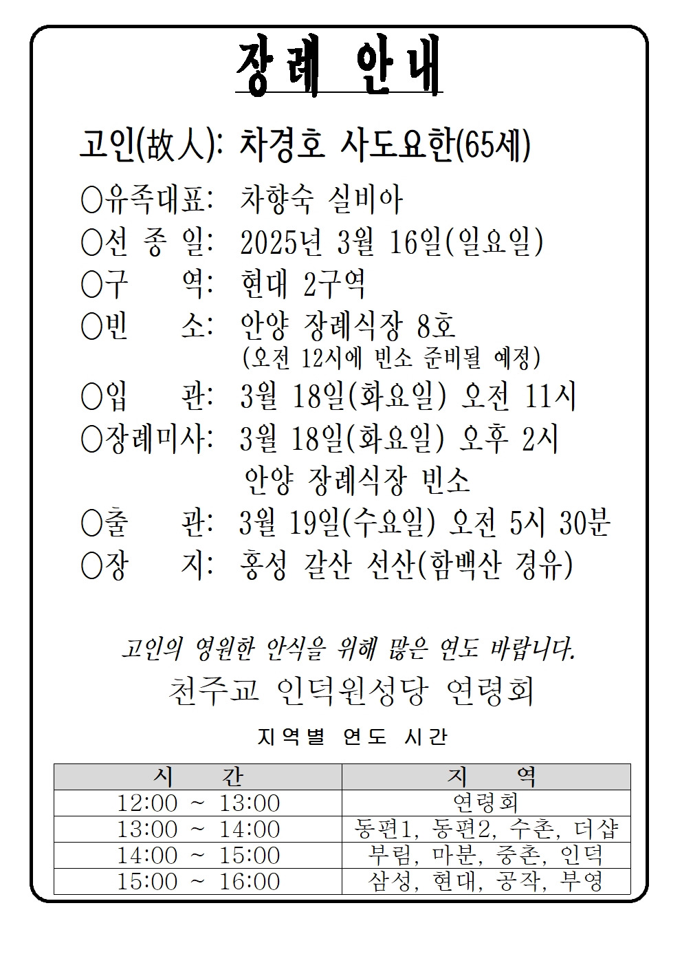 [부고] 차경호 사도요한(65세) 선종 작성자사도요한(사무장)|작성시간25.03.18|조회수56 목록 댓글 0 글자크기 작게가 글자크기 크게가 다음검색 현재 게시글 추가 기능 열기 북마크 공유하기 신고 센터로 신고 댓글 댓글 0 댓글쓰기 답글쓰기 댓글 리스트