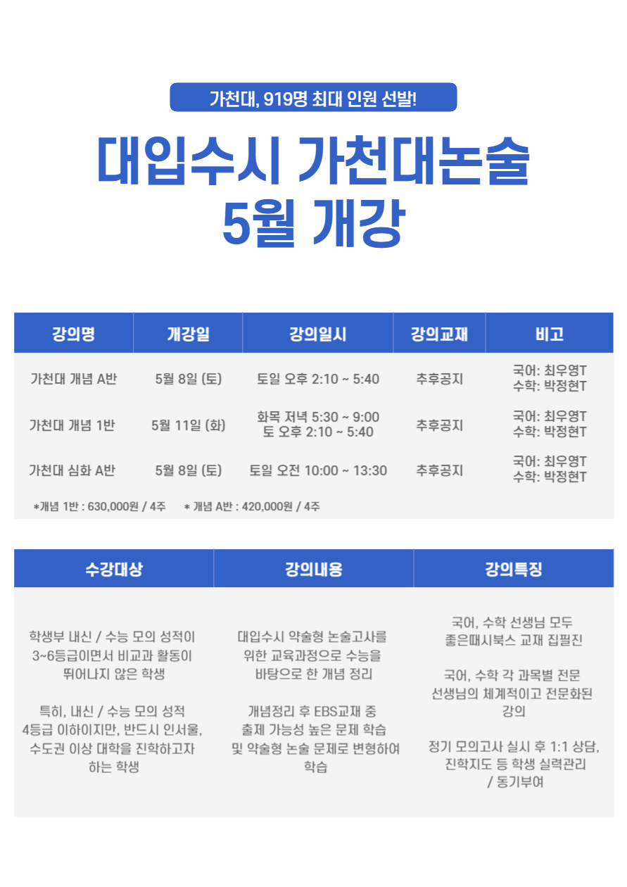 2022학년도 대입수시 가천대 논술 5월 개강을 안내 드립니다.