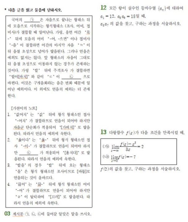 | 출제 방향 | - EBS 수능 연계 교재를 중심으로 출제(EBS 연계율 80% 이상) - 고등학교 중간, 기말 정기고사의 주관식 문항 난이도로 출제 | ||