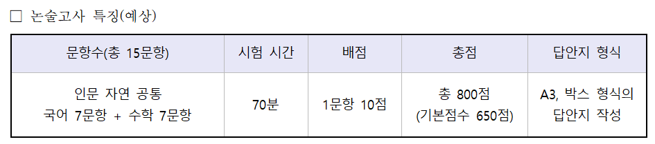 여기서 화법과 작문은 출제되지 않습니다. (→ 가천대, 삼육대와 차이점) 답안지는 A3 용지 형태로, 원고지 형식이 아닌 직사각형 답안 칸에 핵심 내용을 서술하는 형식입니다.