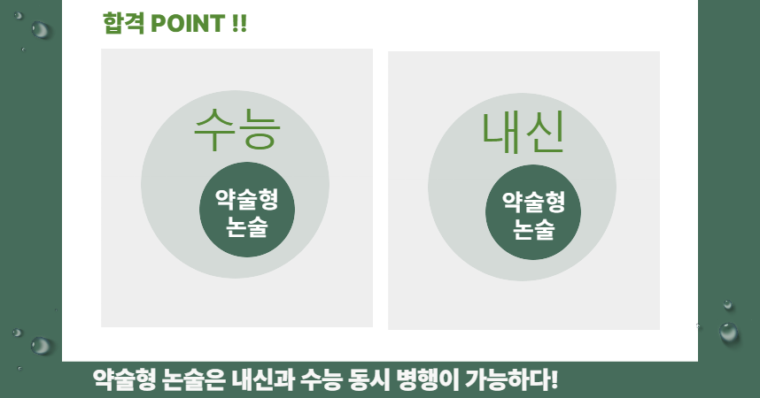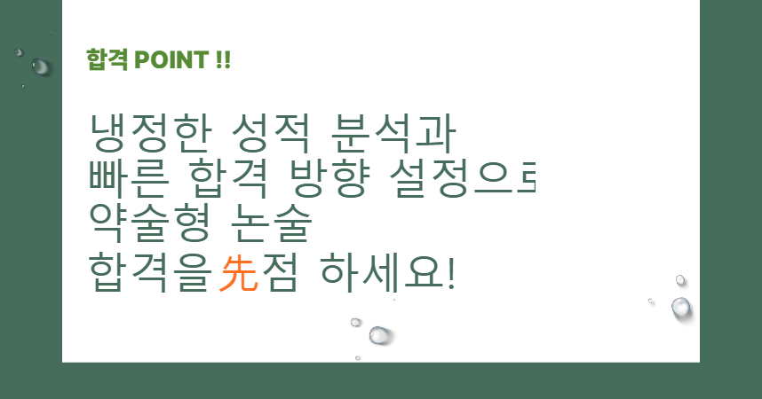 저희 학원에서 공부한 재원생 중 합격률을 분석해보더라도 동일한 성적대인 학생의 경우 겨울방학 또는 1학기 초에 약술형 논술을 준비한 학생이 기말고사 후 또는 여름방학을 전후해서 공부를 시작한 학생보다 합격률이 2배 이상은 높았습니다.