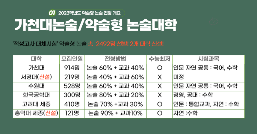 2023학년도 약술형 논술로 가천대 914명, 서경대 219명(신설), 수원대 528명, 한국공학대(구 한국산업기술대) 300명, 고려대(세종) 410명, 홍익대 세종 (신설, 자연, 캠퍼스 자율전공-자연예능만 선발) 121명 모집 6개 대학 총 2492명 선발 예정입니다.