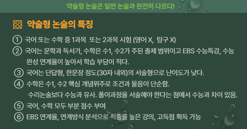 국어 EBS수특 문학, 독서, 수학 EBS 수1,수2가 약술형 논술 주된 출제 범위여서 수능 대비 속에 포함이 저절로 되어 있습니다.