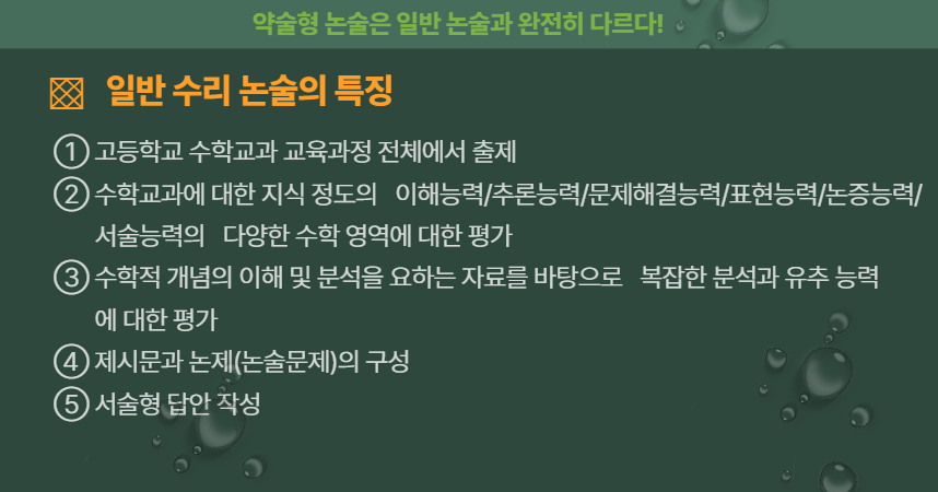 이해능력/추론능력/문제해결능력/표현능력/논증능력/서술능력의 다양한 수학 영역에 대한 평가를 합니다. 제시문과 논제로 구성되고 <논제>에서 제시하는 조건과 물음에 다양한 요구 사항이 있으며, 그 요구 사항에 맞춰 서술의 방향성을 분석하고 그 방향에 맞춰 답안을 작성해야 한다.