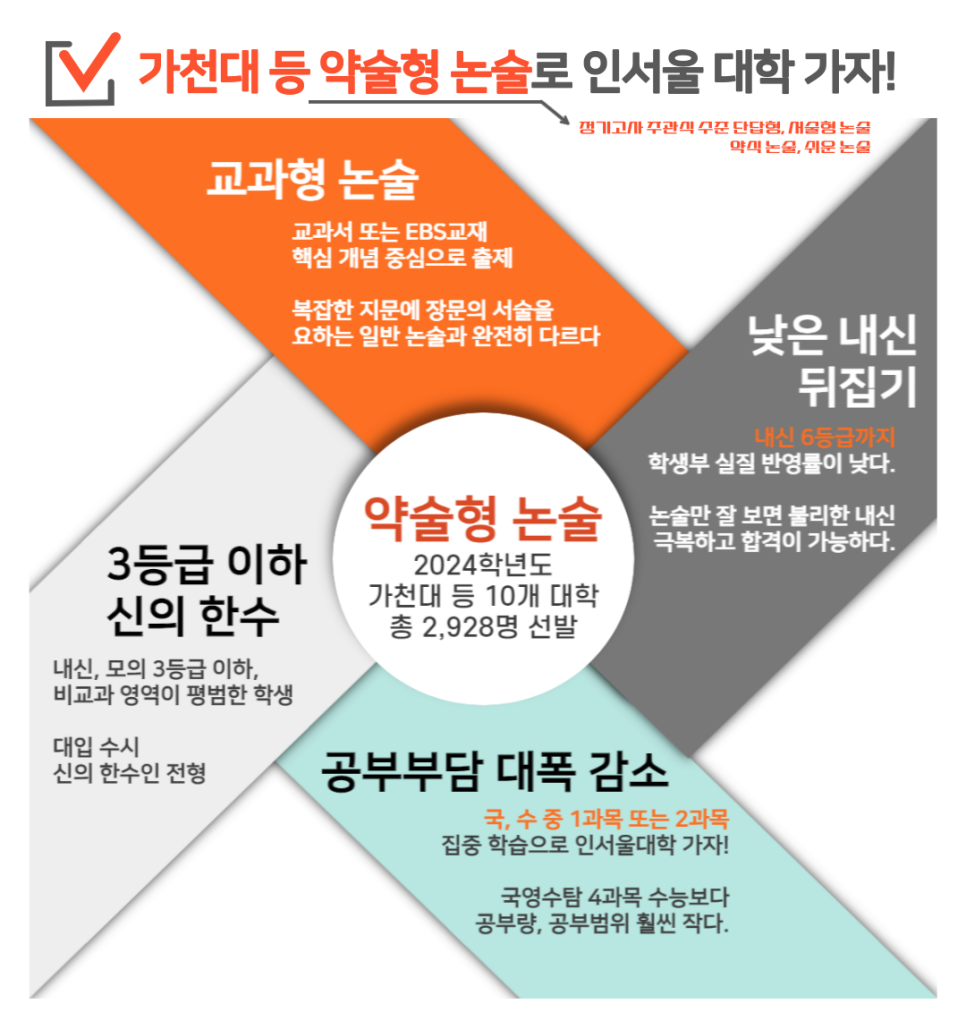 안녕하세요! 2024학년도 ‘적성고사 대체시험’ 약술형(약식) 논술 합격을 위한 가이드! 약술 논술(구 적성고사 포함)만을 10여년 이상 전문적으로 연구하고 강의하는 목동씨사이트학원입니다.