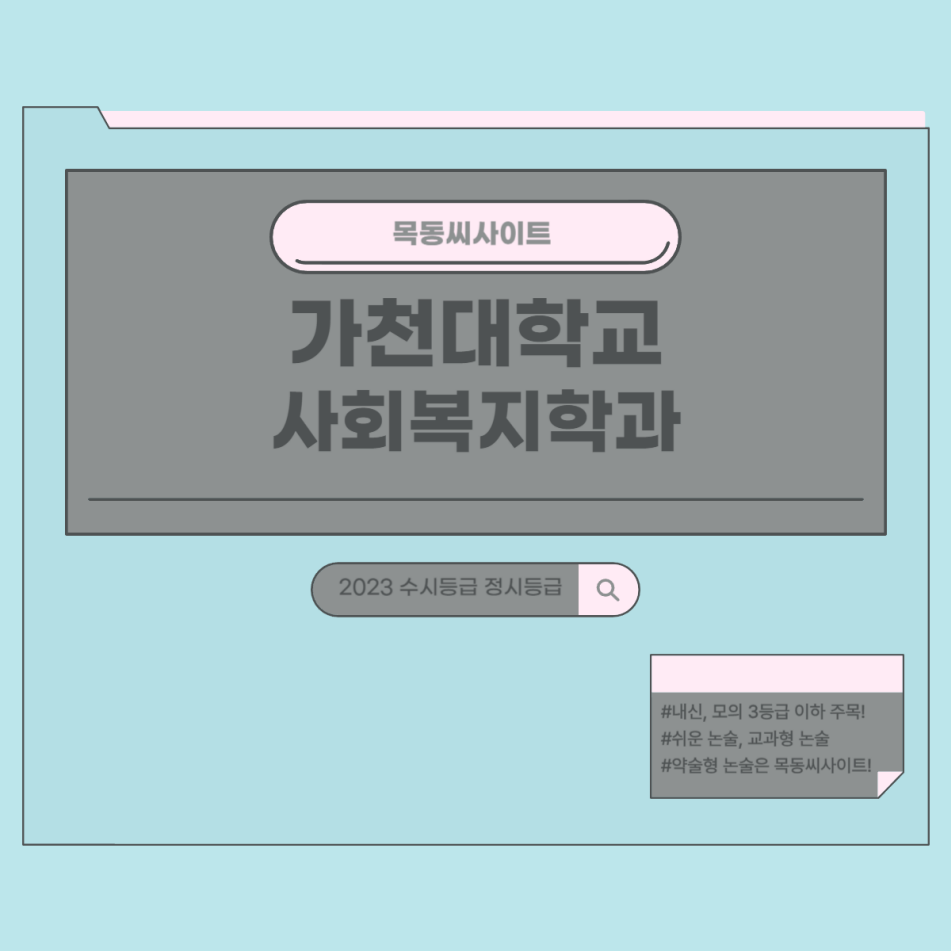 위 입시 결과를 참고하여 학생부 교과나 종합 혹은 정시로 가천대 사회복지학과에 합격하기가 어렵다고 판단되는 학생 중 1. 가천대식 내신 산출 후 내신 7등급 이내(기왕이면 6이내) 2. 수능 최저 국수영탐(1) 1개 3등급 3. 수능 모의 국어 6등급 이내, 수학 5등급 이내의 실력인 학생은 수시 기회의 전형인 약술형 논술 도전을 10여 년 이상 전문성을 인정받은 가천대 논술 학원인 목동씨사이트에서 적극적으로 고려해보세요.