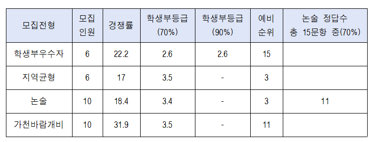 ·논술 : 학생부 교과 40%+논술(약술형) 60%, 수능 최저 0 : 국수영탐(1) 중 1개