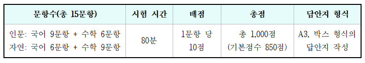 가천대 논술고사는 총 15문항으로 80분 1교시로 실시가 됩니다. 다만 계열별 특징을 고려하여 인문은 국어 9문항 + 수학 6문항, 자연은 국어 6문항 + 수학 9문항이 출제됩니다. 배점은 1문항당 10점으로 기본 점수 850점과 논술고사 150점을 더해 총 1,000점 만점을 기준으로 성적 순으로 합격자를 선발합니다. 답안지는 원고지 양식이 아니라 문제 수에 따라 직사각형 모양의 답안 공간이 있는 A3 크기입니다.