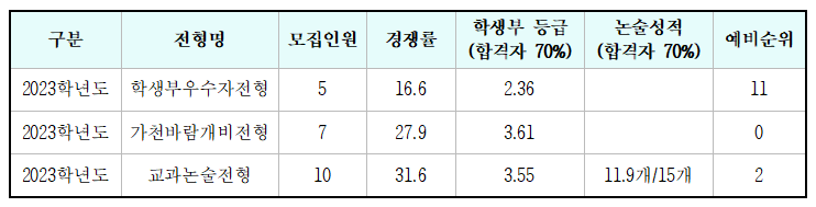 2023학년도 입결을 보실 때 다음과 같은 각 전형별로 전형 비율과 수능 최저 등을 참고해야 합니다. 학생부 우수자 전형은 학생부 교과 100%로 수능 최저학력 기준은 국수영탐(1) 중 2합 6이었습니다. 학생부 종합 전형인 가천바람개비는 1단계 서류 100%로 모집 인원의 4배수를 선발하고, 2단계로 면접을 보아 면접 50% + 1단계 평가 50%로 이루어지고, 요구하는 수능 최저 기준은 없었습니다. 교과논술 전형은 학생부 교과 40% + 논술 60%를 반영하고 수능 최저로 국수영탐(1) 중 1개 3등급을 요구했습니다.