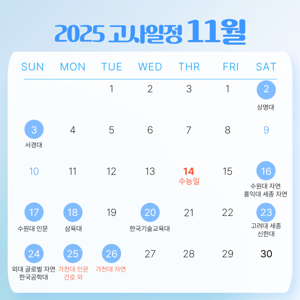 11월 고사 실시대학 : 수능 전 상명, 서경