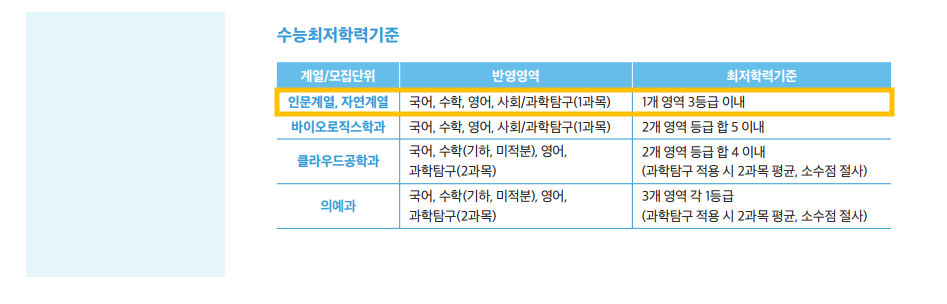 수능 최저로 일부 학과를 제외하고 1개 영역 3등급만 받으시면 됩니다. 탐구 1과목 3도 가능합니다.
