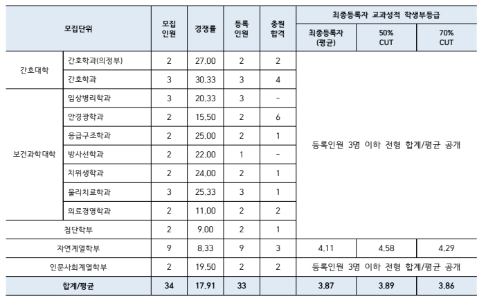 표에 나타난 충원합격은 최초 합격 인원을 제외한 마지막 충원합격자의 순위를 뜻합니다. 최종등록자는 최초합격자와 충원합격자 중 등록한 사람에 한합니다. 학생부는 각 모집단위별 평가에 반영된 학생부 교과의 성적을 환산한 점수입니다. (소수 셋째자리에서 반올림) 마지막으로 합계/평균에서 모집인원은 해당 전형의 모든 모집단위의 합, 경쟁률은 해당 전형 전체 지원인원/전체 모집인원(소수 셋째자리에서 반올림) 교과 성적 학생부등급은 해당 전형의 모든 모집단위의 학생부 등급의 평균(소수 셋째자리에서 반올림)입니다.