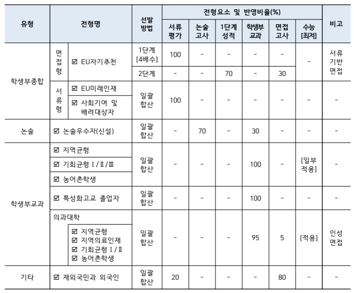 올해부터 '사회기여 및 배려대상자' 전형은 '논술' 시행 전형으로 모집합니다. 참고 바랍니다.