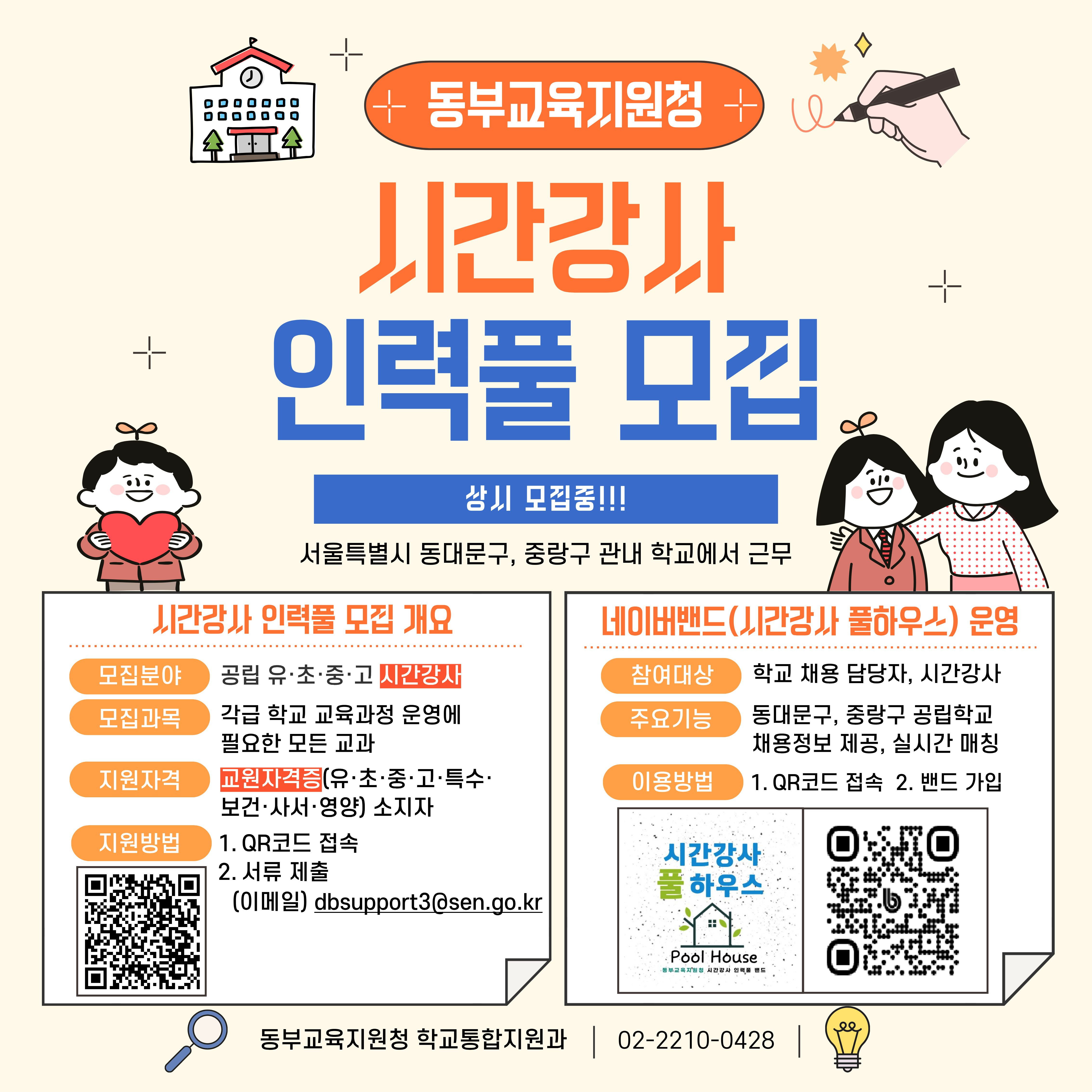 서울특별시동부교육지원청에서는 관내 학교(동대문구, 중랑구)에서 근무하실 시간강사 인력풀을 상시 모집하고 있습니다.