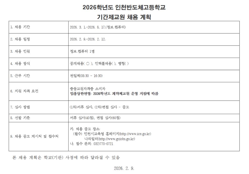 [서울/경기/인천][인천] 인천반도체고등학교에서 선생님을 모십니다. 작성자고라니|작성시간26.02.12|조회수68 목록 댓글 0 글자크기 작게가 글자크기 크게가 인천반도체고등학교에서 선생님을 모십니다.1. 채용 예정 교과 및 인원- 정보 1명2. 채용 기간: 6개월많은 관심 부탁드립니다!! 다음검색 현재 게시글 추가 기능 열기 북마크 공유하기 신고 센터로 신고 댓글 댓글 0 댓글쓰기 답글쓰기 댓글 리스트