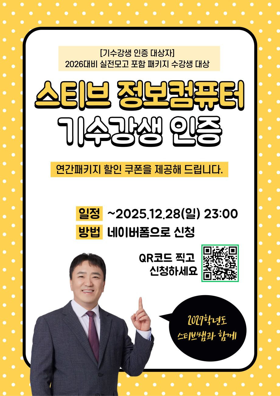 [G스쿨] 기수강생 인증 및 연간패키지 할인 안내(실전모고 포함 패키지 수강생 대상) 작성자G스쿨|작성시간25.12.11|조회수263 목록 댓글 0 글자크기 작게가 글자크기 크게가 위 이미지를 클릭하시면 스티브 정컴 페이지로 이동합니다. 다음검색 현재 게시글 추가 기능 열기 북마크 공유하기 신고 센터로 신고 댓글 댓글 0 댓글쓰기 답글쓰기 댓글 리스트