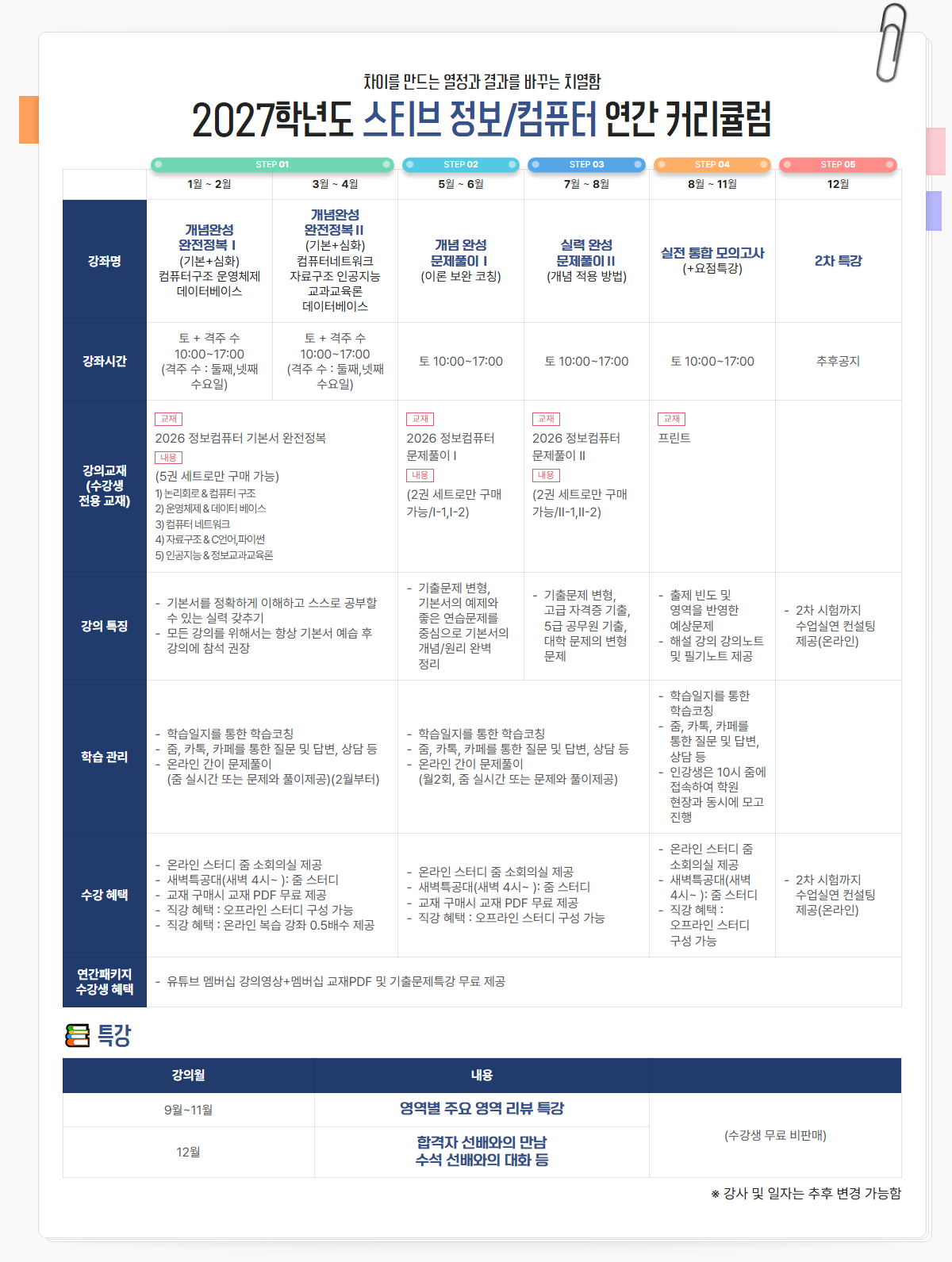 [G스쿨] 2027대비 연간 커리큘럼(스티브 정보컴퓨터) 작성자G스쿨|작성시간25.12.12|조회수321 목록 댓글 1 글자크기 작게가 글자크기 크게가 위 이미지를 클릭하시면 스티브 정보컴퓨터 페이지로 이동합니다. 다음검색 현재 게시글 추가 기능 열기 북마크 공유하기 신고 센터로 신고 댓글 댓글 1 댓글쓰기 답글쓰기 댓글 리스트 해당 댓글은 작성자와 운영진만 볼 수 있습니다. 댓글 전체보기