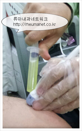 주사기로 관절액을 뽑아 요산결정이 있는지 없는지 확인 후 통풍진단을 내리게 되는 것입니다.
