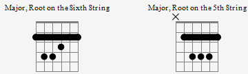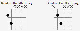 왼쪽은 6번줄, 오른쪽은 5번줄 루트인 메이저 코드의 다이어그램이야.