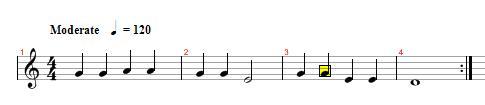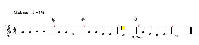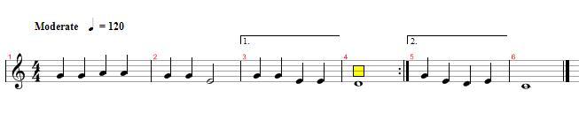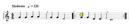 다들 아는 국민동요 학교종을 찍어보았다. 이렇게 도돌이표가 한쪽에 나타나있을경우 연주 순서는 1-2-3-4-1-2-3-4 즉 처음부터 도돌이표까지 갔다가 다시 처음으로 돌아가는것이다. 다음번에는 도돌이표를 그냥 지나친다.