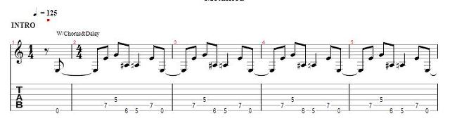 대개의 경우 타브악보는 위처럼 오선지와 같이 나오기 때문에 타브악보에 별다른 음의 길이를 표시해주지 않습니다.