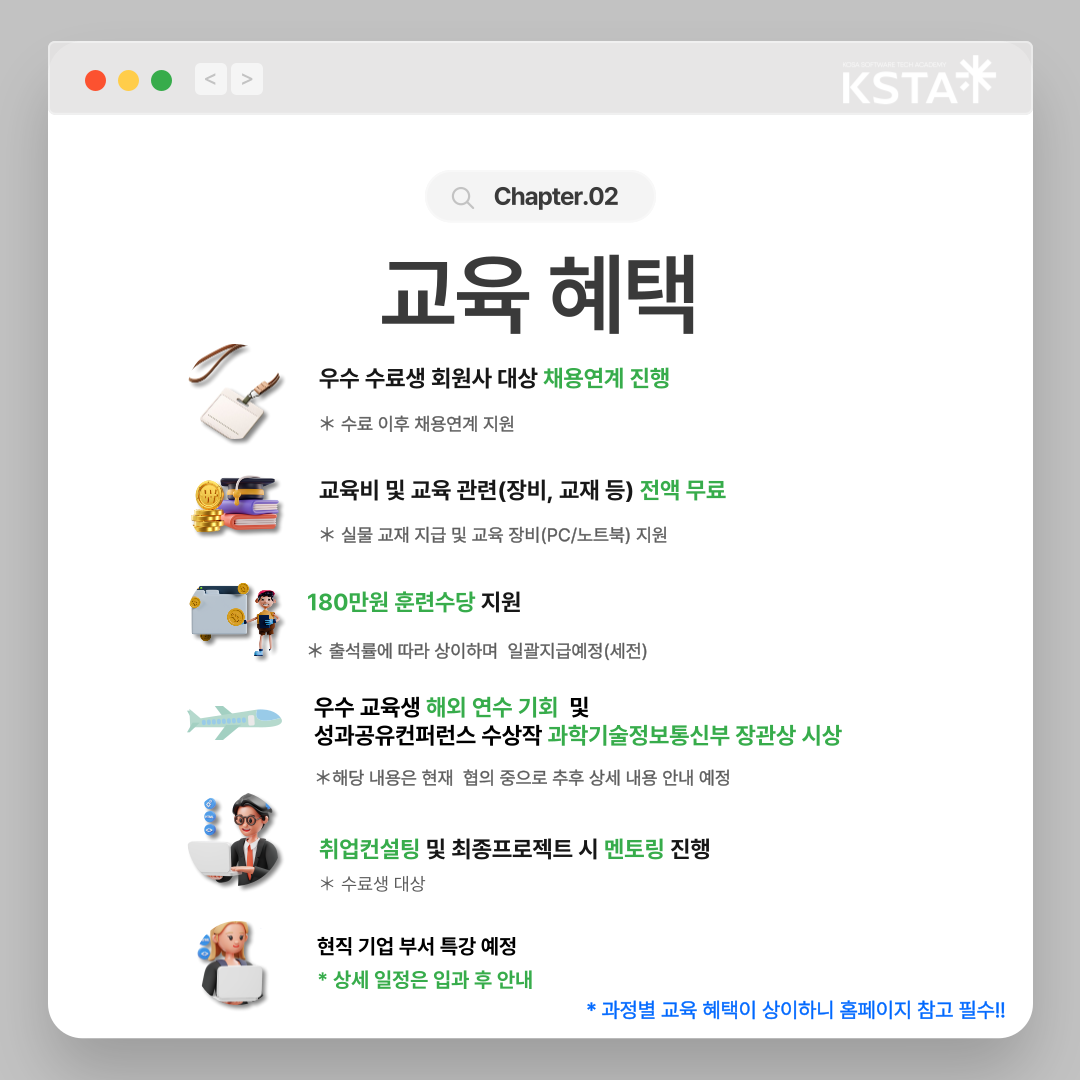 등 다양한 교육혜택이 있으며, 과정별로 혜택이 상이하니 홈페이지 참고 바랍니다.
