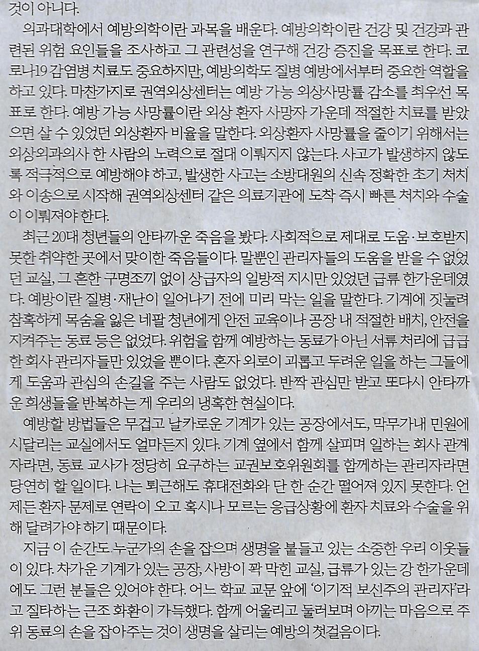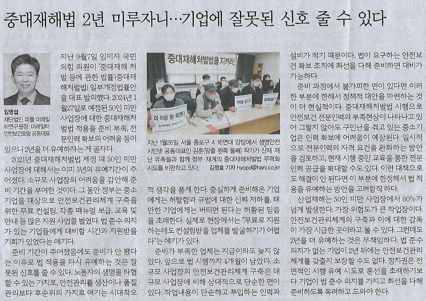 왜냐면/ 임영섭 재단법인 피플 미래일터연구원장·미래일터안전보건포럼 공동대표/ 중대재해법 2년 미루자니…기업에 잘못된 신호 줄 수 있다( 작성자정천식|작성시간23.09.27|조회수14 목록 댓글 0 글자크기 작게가 글자크기 크게가 다음검색 현재 게시글 추가 기능 열기 북마크 공유하기 신고 센터로 신고 댓글 댓글 0 댓글쓰기 답글쓰기 댓글 리스트