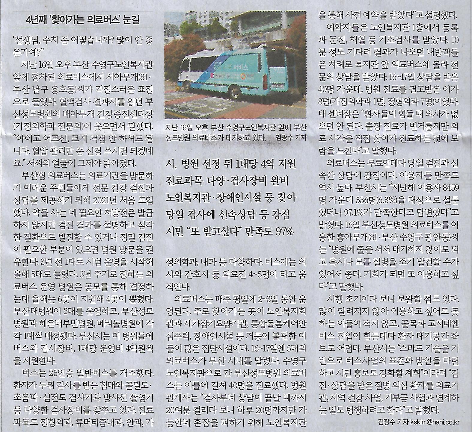 전국/ 부산 ‘왕진버스’ 5대 빵빵~“편해서 억수로 좋심니더”/ 4년째 ‘찾아가는 의료버스’ 눈길(민중이 깨어나야 나라가 바로 선다) 작성자정천식|작성시간24.04.19|조회수11 목록 댓글 0 글자크기 작게가 글자크기 크게가 다음검색 현재 게시글 추가 기능 열기 북마크 공유하기 신고 센터로 신고 댓글 댓글 0 댓글쓰기 답글쓰기 댓글 리스트