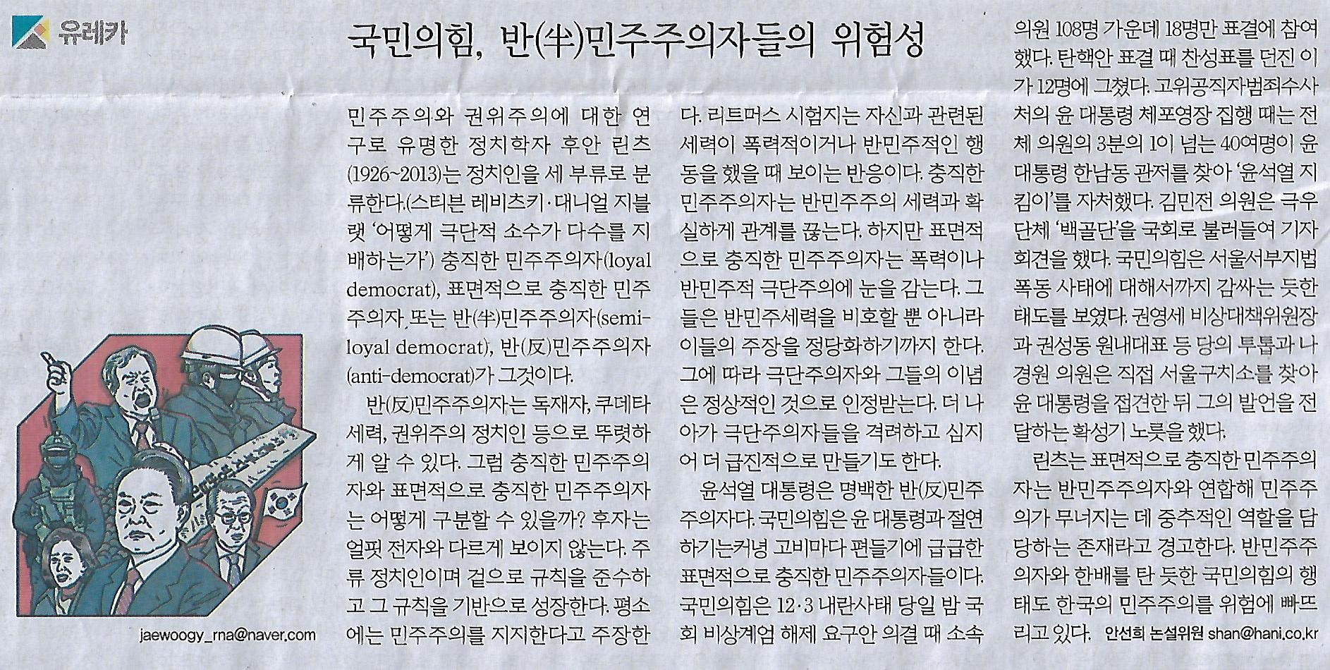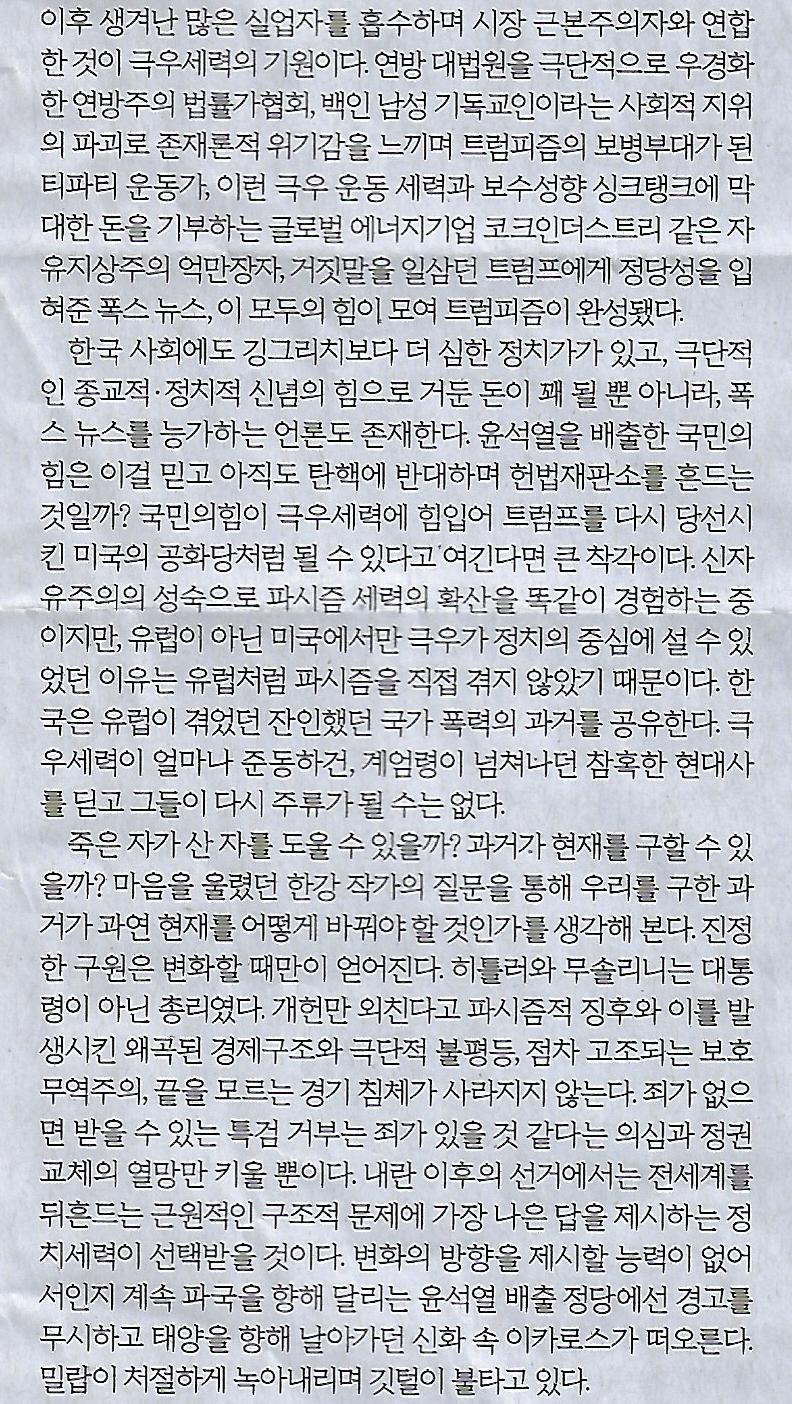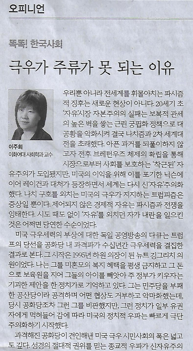 오피니언/ 똑똑! 한국사회/ 극우가 주류가 못 되는 이유/ 이주희 이화여대 사회학과 교수/ 군에 심각한 트라우마, 비겁한 군 통수권자/ 작성자정천식|작성시간25.02.19|조회수12 목록 댓글 0 글자크기 작게가 글자크기 크게가 다음검색 현재 게시글 추가 기능 열기 북마크 공유하기 신고 센터로 신고 댓글 댓글 0 댓글쓰기 답글쓰기 댓글 리스트