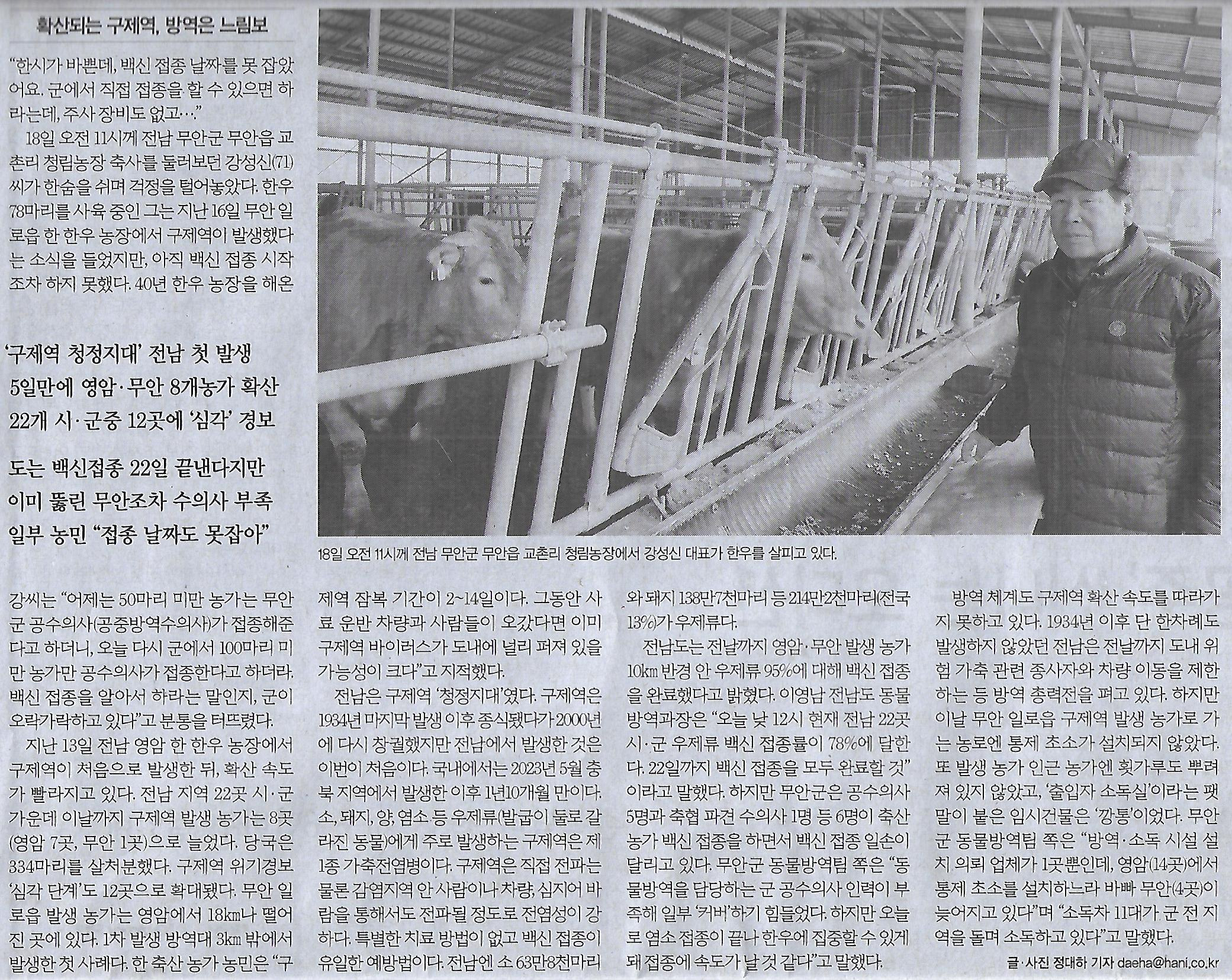 전국/ “백신 접종 급한데…” 무안 한우농가 발동동/ 확산되는 구제역, 방역은 느림보(민중이 깨어나야 나라가 바로 선다) 작성자정천식|작성시간25.03.20|조회수22 목록 댓글 0 글자크기 작게가 글자크기 크게가 다음검색 현재 게시글 추가 기능 열기 북마크 공유하기 신고 센터로 신고 댓글 댓글 0 댓글쓰기 답글쓰기 댓글 리스트