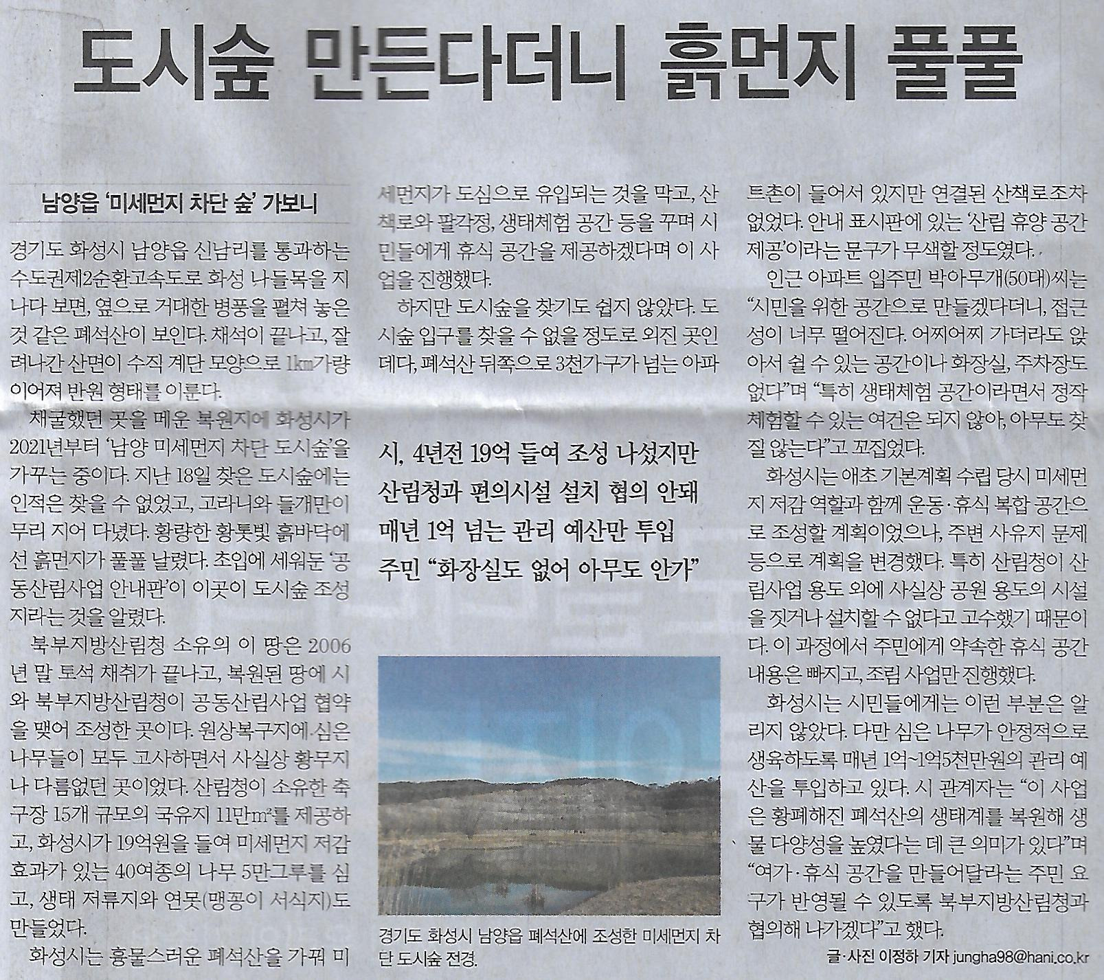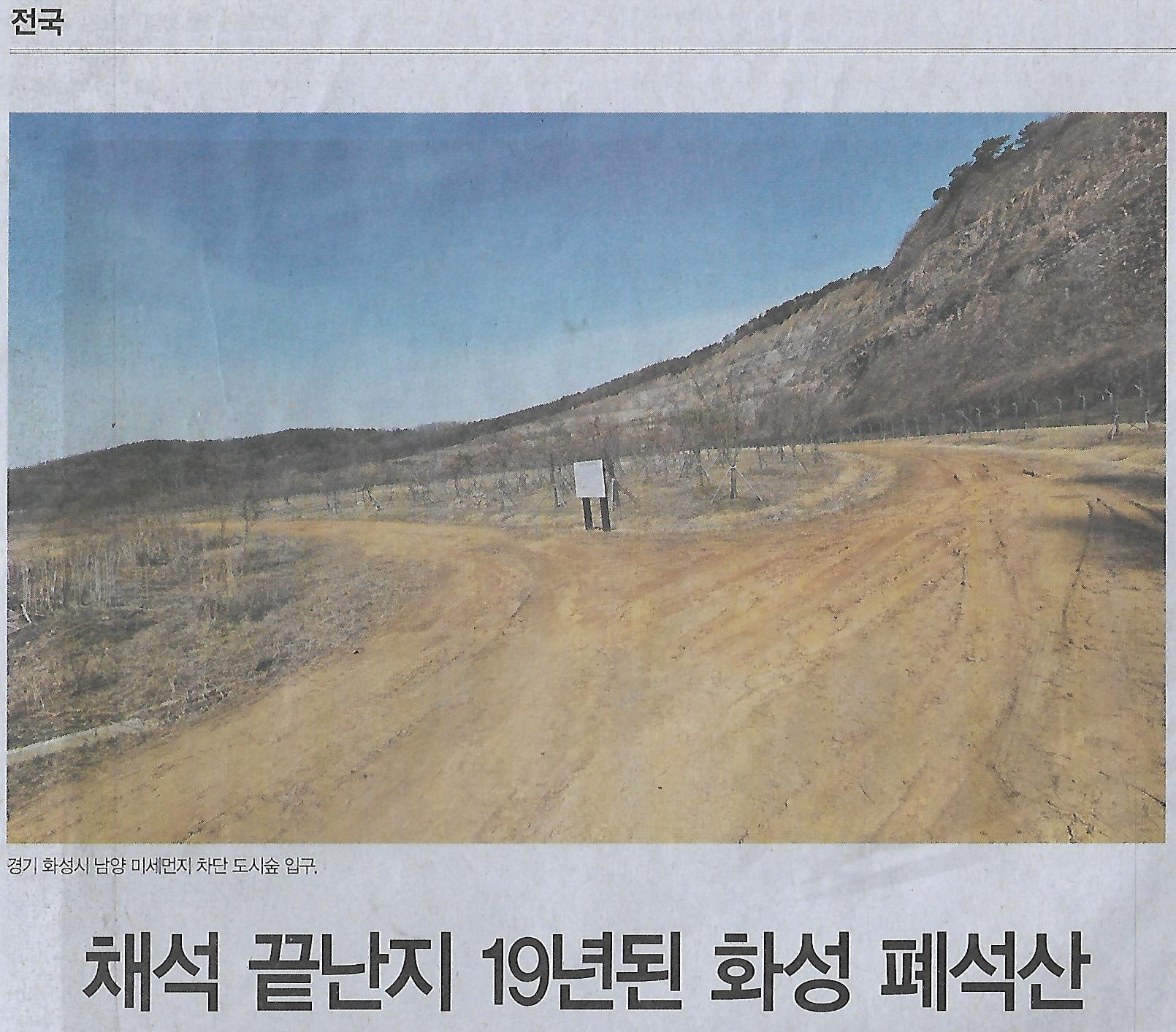 전국/ 채석 끝난지 19년된 화성 폐석산, 도시숲 만든다더니 흙먼지 풀풀/ 남양읍 ‘미세먼지 차단 숲’ 가보니(민중이 깨어나야 나라가 작성자정천식|작성시간25.03.21|조회수13 목록 댓글 0 글자크기 작게가 글자크기 크게가 다음검색 현재 게시글 추가 기능 열기 북마크 공유하기 신고 센터로 신고 댓글 댓글 0 댓글쓰기 답글쓰기 댓글 리스트