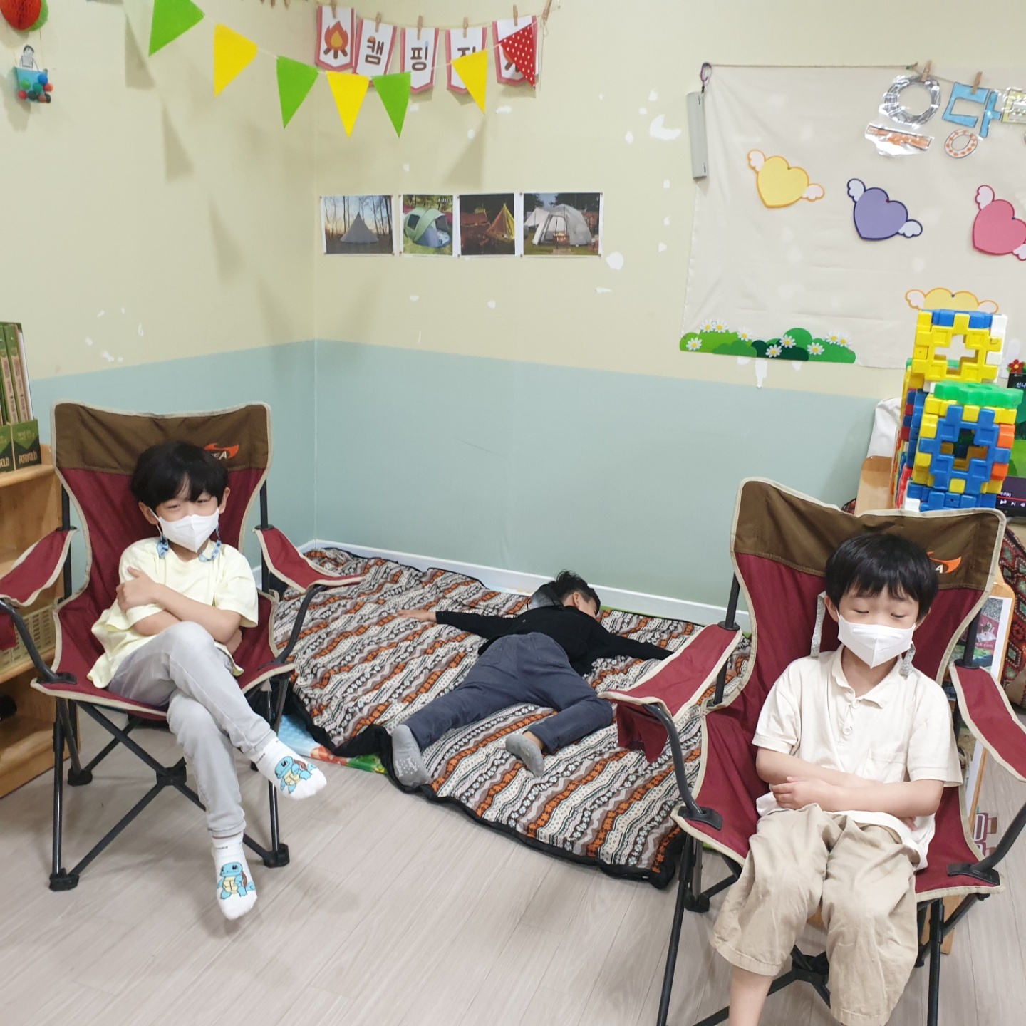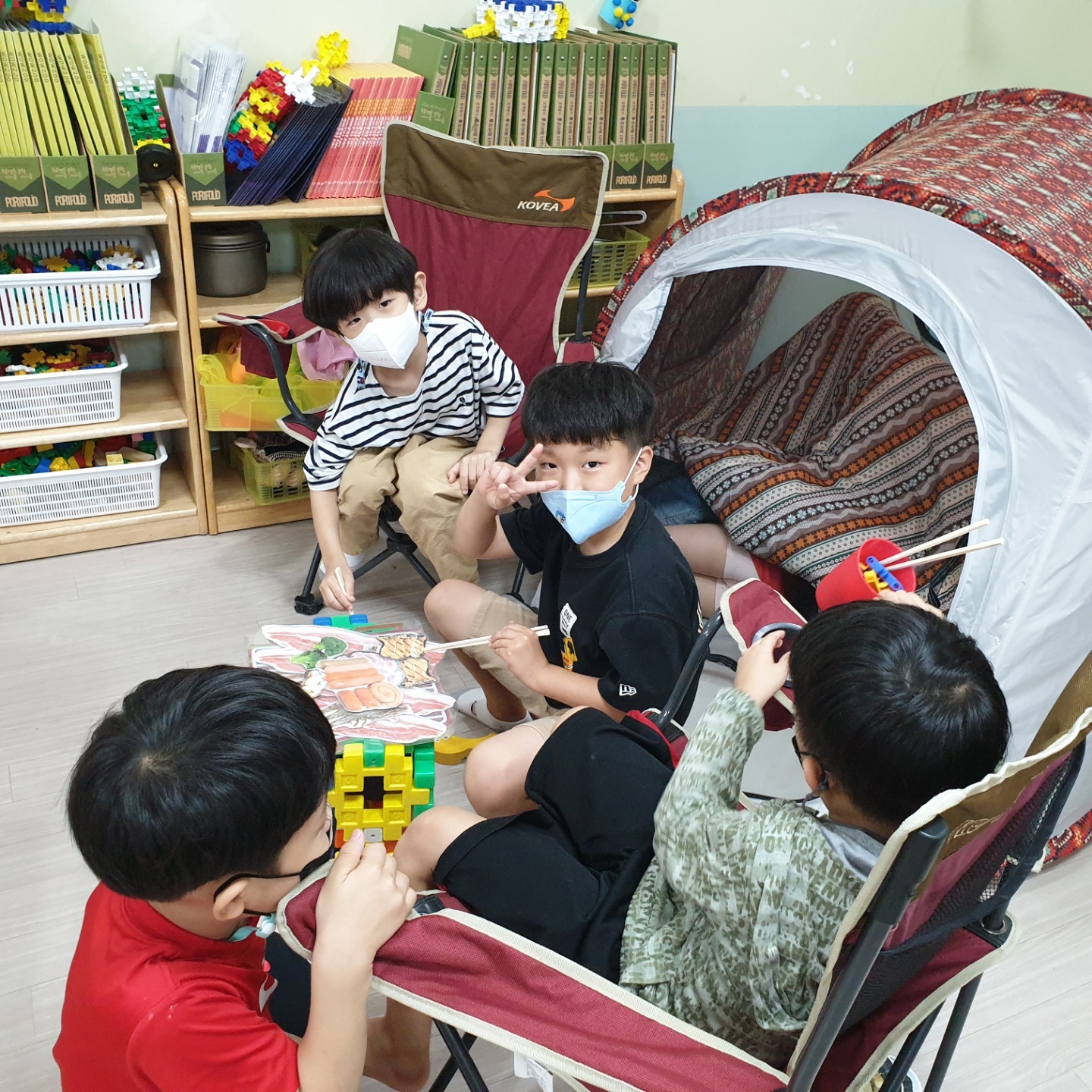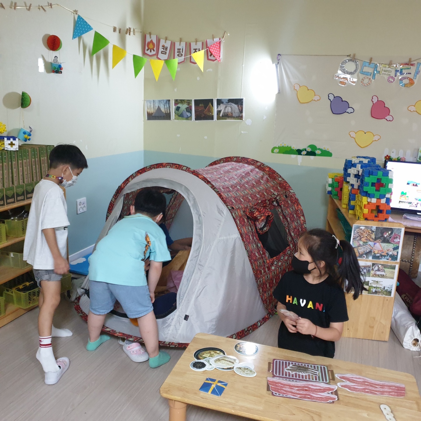 아이들이 요구한 텐트와 구이용 음식사진들을 지원해주니 진짜 캠핑이라도 온 듯 즐거워합니다.