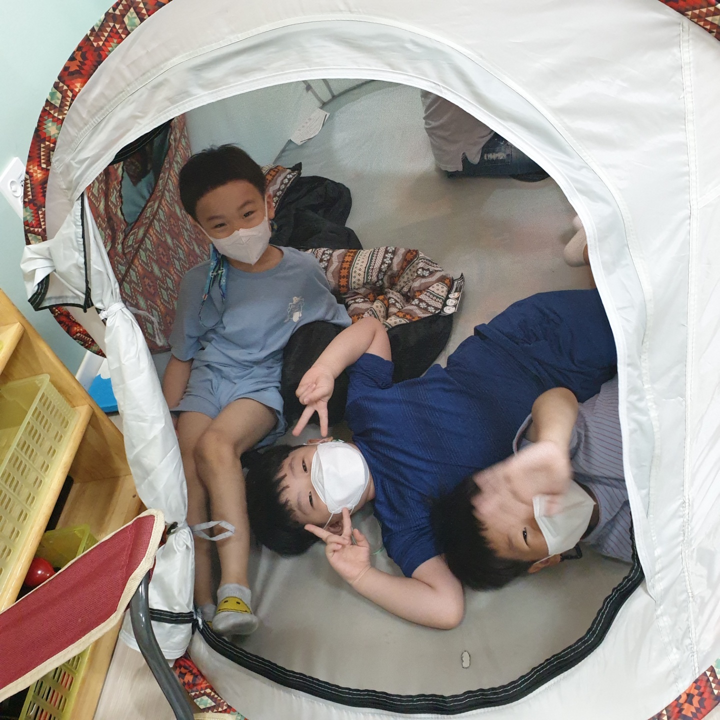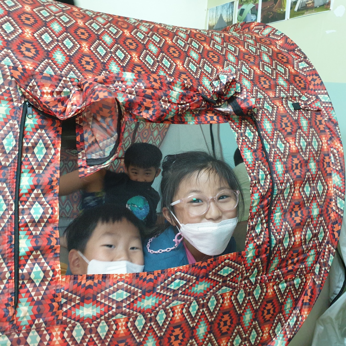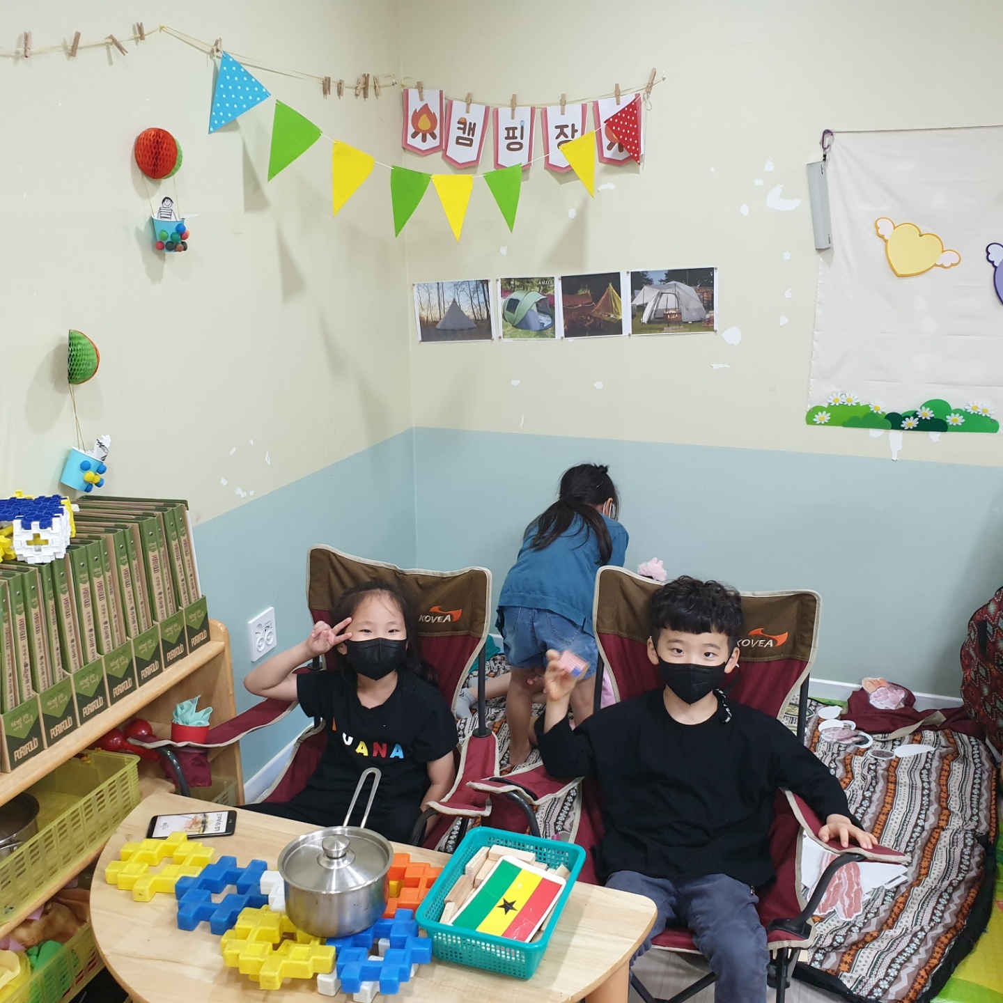 아이들이 요구한 텐트와 구이용 음식사진들을 지원해주니 진짜 캠핑이라도 온 듯 즐거워합니다.