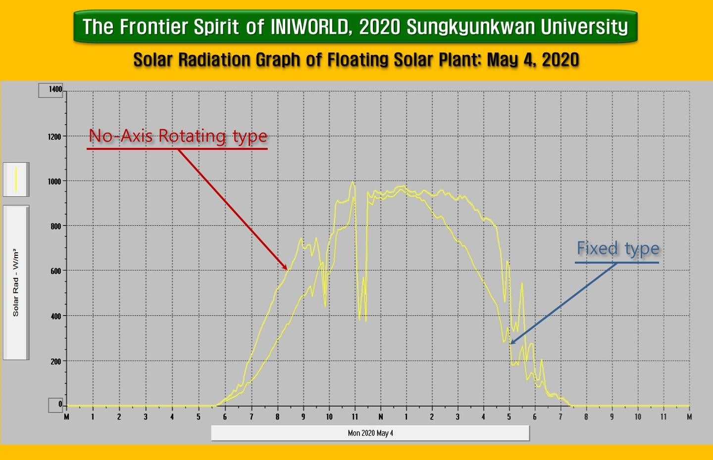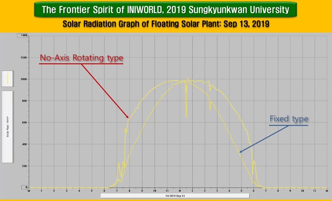태양광 발전 사업의 판도를 뒤흔드는 일을 2016년부터 수원시 일월 저수지에서 진행했으며 현재까지 외국 어느 누구도 도달하지 못한 정상을 한국의 대학과 발명가가 도착했다는 사실을 국내외 협회 및 저널에 논문 게재하여 알렸다. 아이앤아이월드가 성대와 함께 획득한 기술은 이제 막 진화를 시작했다. 양면형 모듈을 품으면 발전량이 더욱 상승하기 때문이다. 후면광효과는 태양빛과 법선을 이룰 때 최적의 발전이득을 달성하기에 그렇다. 후면 반사판을 장착하게 되면 '40% 이상 발전효율 증가' 달성 가능하다. 기술획득 이후 5년여 검증 시간을 인내로 극복한 지금, 아이앤아이월드는 한국 에너지 인프라를 개조하고자 '변화의 문'을 두드리고 있다.