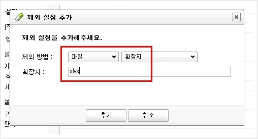 환경설정에서 제외설정 추가 로 들어가서 제외방법을 파일, 확장자를 선택한후 엑셀 확장자인 xlsx 를 입력해주고