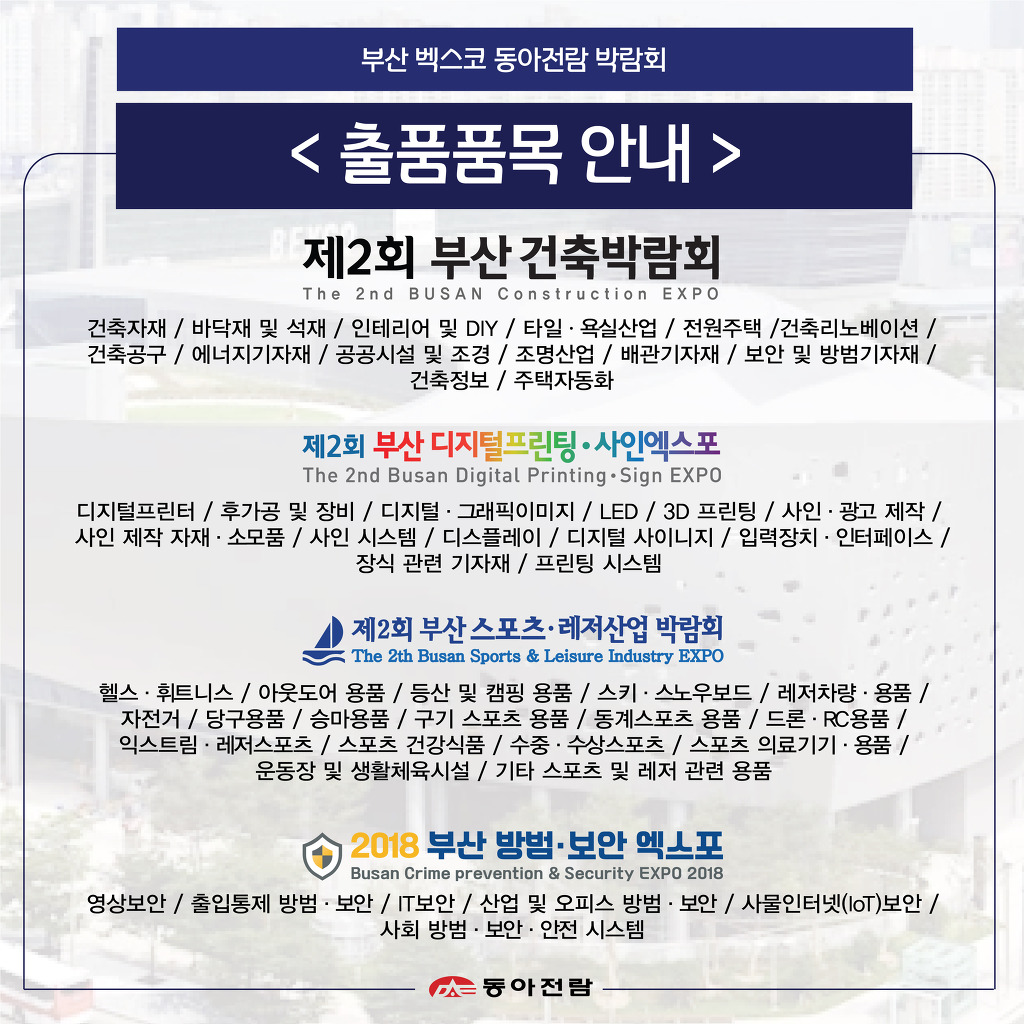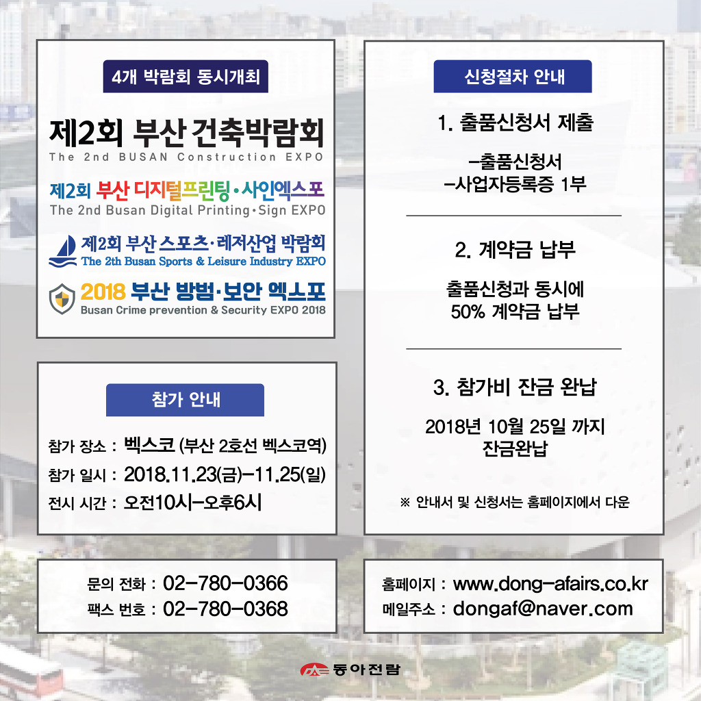 [부산 BEXCO] 동아전람 박람회 참가기업 모집 작성자동아전람|작성시간18.09.18|조회수8 목록 댓글 0 글자크기 작게가 글자크기 크게가 [부산 BEXCO] 동아전람 박람회 참가기업 모집 다음검색 현재 게시글 추가 기능 열기 북마크 공유하기 신고 센터로 신고 댓글 댓글 0 댓글쓰기 답글쓰기 댓글 리스트
