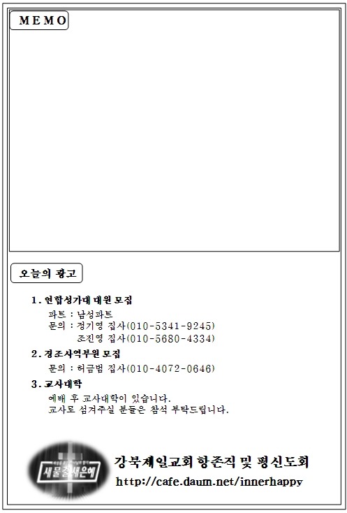 작성자진양이 작성시간 12.02.05 혹시 주일예배 장소 어딘가요? 황목사님 설교가 가장 큰 힘이 됩니다.,... 위치를 모르니 갈 수가 없네요,ㅠㅠ