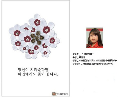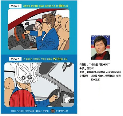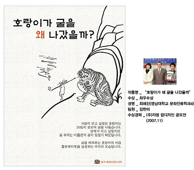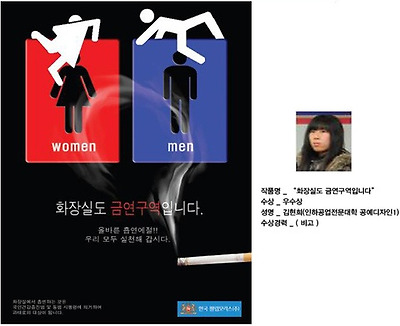 작년 최우수 작품인 "호랑이가 왜 굴을 나왔을까?" . 오래 전 단군신화 곰과 호랑이 이야기를 아이디어로 한 작품이다. 곰과 호랑이가 사람이 되기 위해 쑥과 마늘을 먹으며 고통을 견뎌낼 때, 호랑이가 동굴을 뛰쳐나온 이유는 비흡연자인 곰을 위해 흡연자인 호랑이가 동굴을 나왔다는 다소 해학적인 내용이다. 그만큼 비흡연자를 배려해야 한다는 의미를 담고 있다. 최우수 작품은 현재 흡연 에티켓 캠페인 스티커로 제작 되어 군부대나, 대학교내 등에 부착되고 있다.