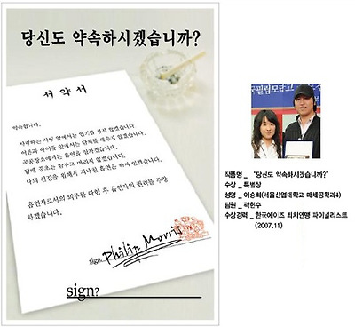필립 모리스 흡연 에티켓 광고공모전은 2회째를 맞고있다. 우선 필립모리스라는 세계적 기업의 광고공모전이니 만큼 수상경력이 후에 취업등에 크게 작용할 수 있는 좋은 기회이다. 하지만 한편으로는 총 수상편수가 일반인, 대학생 부분 포함 약 100편정도로 작년 응시편수가 천편정도 였다하니 약 10%정도가 수상가능하다. 이만큼 수상의 확률이 크다는 이점을 가지고 있다. 또한 이번 공모전은 간단한 포토샵이나 일러스트로 작업가능한 인쇄광고 공모전이고, 주제 또한 흡연애티켓 지키기라는 간단한 사회적 주제를 담고있어 누구라도 전공이나 소속, 직업등 상관없이 쉽게 참여가능하다. 실제로 수상자들의 경력을 살펴보면 대부분이 화려한 경력을 가지고 있는것이 아니라 첫출전도 많았으나, 아이디어가 좋아서 당선된 경우가 많다. 물론 일러스트나 포토샵 작업은 공모전 주최측에서 당선후 수정작업을 해주기 때문에, 꼭 디자인에 관련해서 꼭 실력이 좋아야 할 필요는 없다. 결론적으로 공모전을 처음 준비하시는 분이나, 단기간의 작업으로 공모전 수상경력이 필요하신 분들에게는 추천하는 공모전이다.