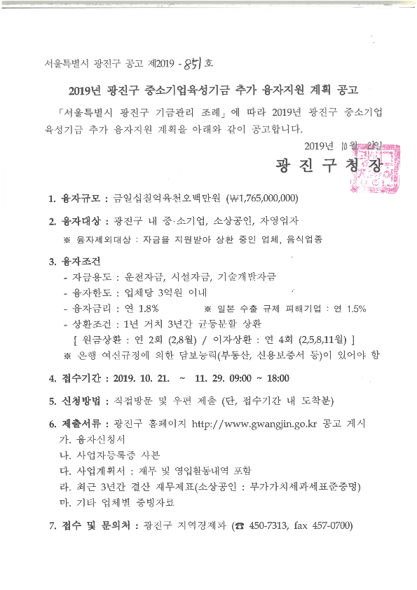 서울시 광진구 (구청장 김선갑)는 지역 내 중소기업·소상공인·자영업자의 자금난 해소와 경영 안정을 위해 ‘2019년 중소기업육성기금 융자지원’을 추가로 실시합니다.