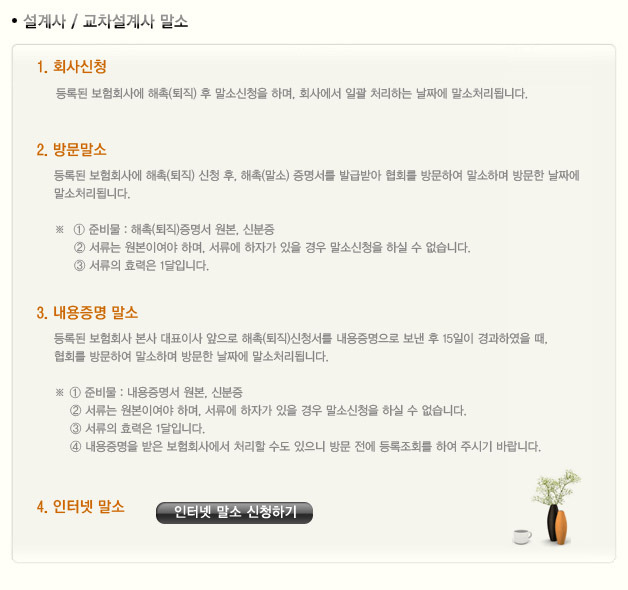 손해보험 설계사 말소/업무페지방법 작성자관리자|작성시간10.05.18|조회수165 목록 댓글 0 글자크기 작게가 글자크기 크게가 출처: http://www.knia.or.kr/Family/fami_sale/recruit/recruit_04_1.asp 다음검색 현재 게시글 추가 기능 열기 북마크 공유하기 신고 센터로 신고 댓글 댓글 0 댓글쓰기 답글쓰기 댓글 리스트