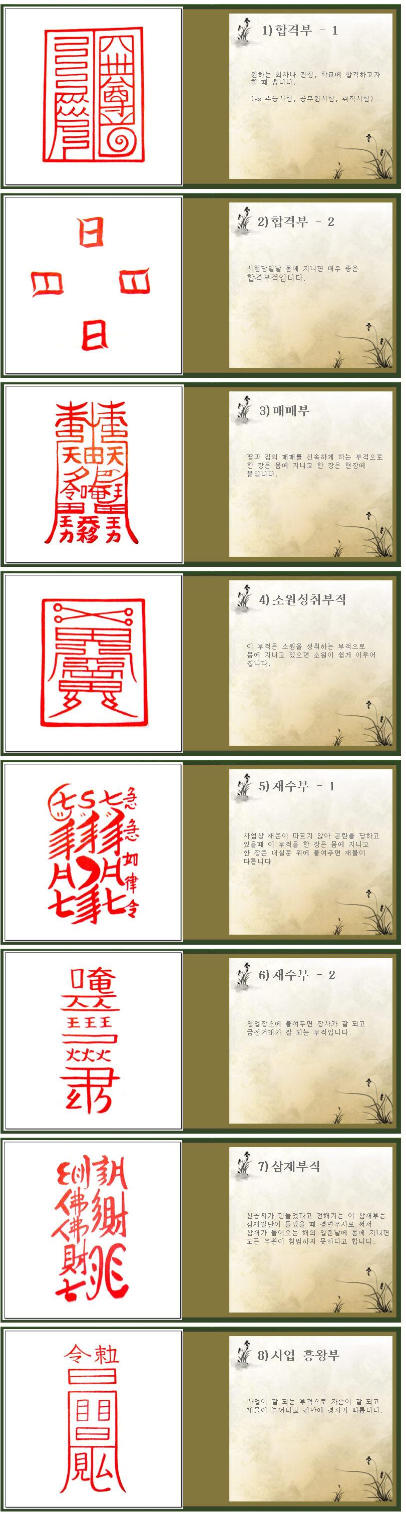 아래에 예시되어 있지 않은 부적(ex 애정원만부적, 결혼해로부적 등등..)도