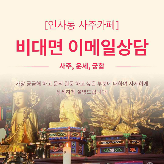 인사동 사주카페는 현재 "비대면 이메일 상담" 만을 오직 진행하고 있습니다. 직접 방문이 어려운 상황에서도 편리하게 부담없이 상담을 받을 수 있도록 돕기 위해서입니다.