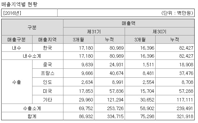 2016년 연결기준 동사는 매출액 3,347.2억원을 시현함.
